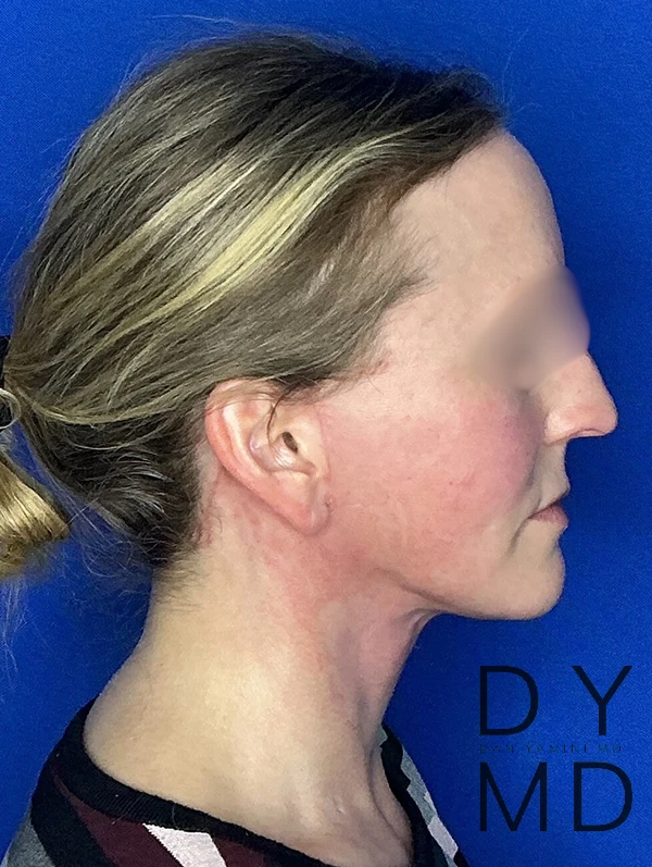 Procedure : This a young woman with familial or hereditary loose and hanging neck which makes her appear older. She desired to have a very defined and youthful neck and jawline. Surgery involved a lower facelift to lift the facial and neck muscles as well as a platysmaplasty which requires a small incision under the chin to tighten and lift the skin and muscles directly under the chin. The procedure requires general anesthesia and a 4 hour surgery with 3 weeks of recovery.