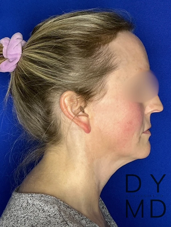 49-year-old woman after scarless minimally invasive neck and jawline lift performed under local in the office